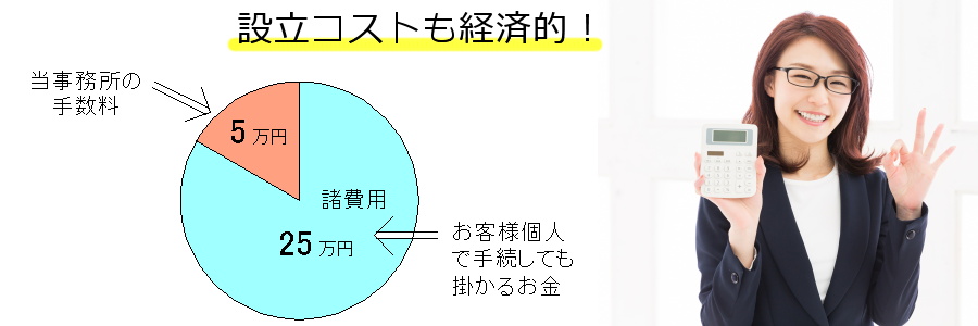 これは、行政書士に頼まずに、お客様個人で株式会社設立の手続きを行っても掛かる費用としての25万円に、当事務所の手数料として5万円を加えたものです。