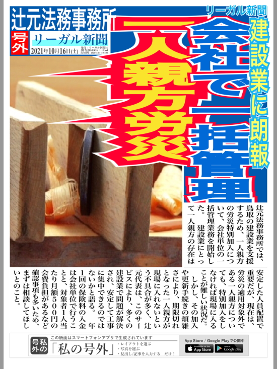 辻元法務事務所では、鳥取県の建設業を支援するため、一人親方の労災特別加入について、会社単位の一括管理業務を開始しました。